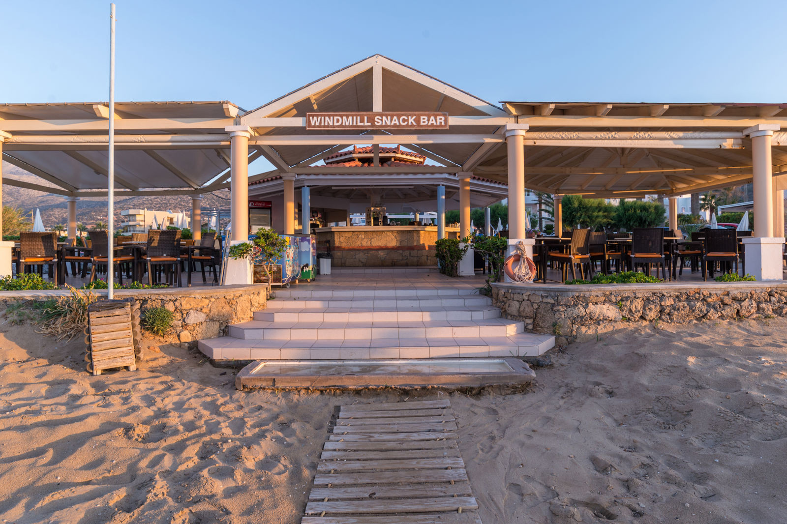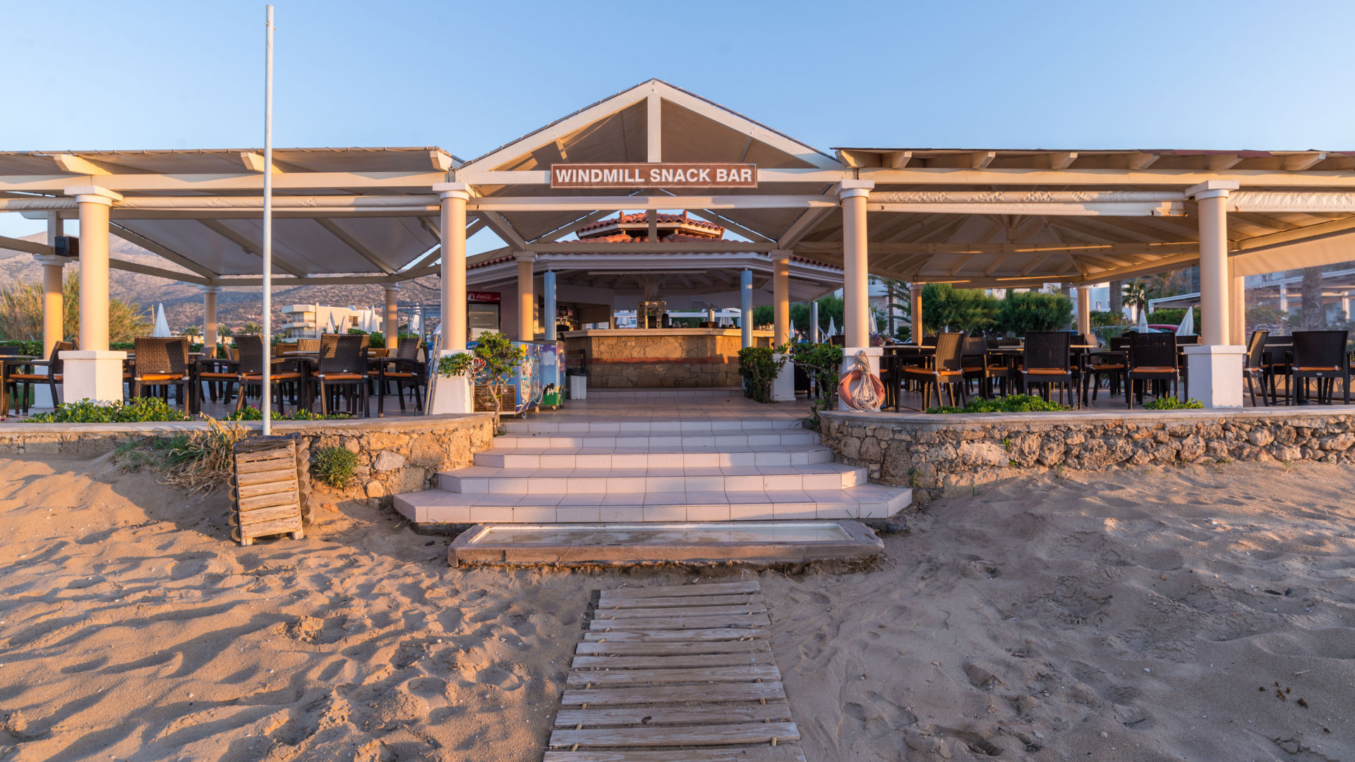 - Aan het openbare strand (Windmill) Zandstrand, Ligbedden tegen betaling, Parasol tegen betaling